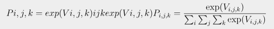 Pi,j,k=exp(Vi,j,k)∑i∑j∑kexp(Vi,j,k)P_{i,j,k} = \frac{\exp(V_{i,j,k})}{\sum_{i}\sum_{j}\sum_{k} \exp(V_{i,j,k})}